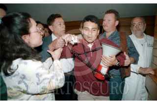 El director del Instituto de Investigaciones Jurídicas, Diego Valdez espera a que estudiantes del CGH le permitan pasar a la torre de rectoria.