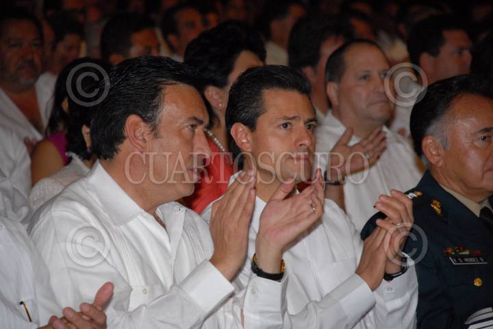 CHETUMAL, QUINTANA ROO, 05ABRIL2011.- César Horacio Duarte, gobernador de Chihuahua, Emilio Gamboa Patrón, líder de la CNOP, Carlos Salinas de Gortari, Ex-Presidente de México, Arturo Escobar Vega, coordinador de los senadores del PVEM y Jorge Emilio González, dirigente del PVEM, estuvieron presentes en la toma de protesta del gobernador Roberto Borge Angulo. FOTO: MARCO POLO GUZMAN HERNANDEZ/CUARTOSCURO.COM
