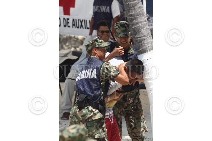 ISLA MUJERES, QUINTANA ROO, 06ABRIL2011.- La secretaria de Marina - Armada de México pondrá en marcha el Operativo Salvavidas 2011, del 15 de abril al 1ro de mayo con el objetivo de brindar seguridad en los principales destinos turísticos de mar del país. En instalaciones de la Quinta Región Naval se realizo una demostración con ejercicios simulados de las acciones que se atienden en este tipo de periodo como por ejemplo riña en la playa, rescate y búsqueda de personas ahogadas en el mar con personal, embarcación y con helicóptero. FOTO: RODOLFO ANGULO/CUARTOSCURO.COM