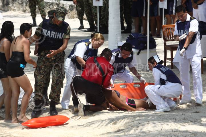 ISLA MUJERES, QUINTANA ROO, 06ABRIL2011.- La secretaria de Marina - Armada de México pondrá en marcha el Operativo Salvavidas 2011, del 15 de abril al 1ro de mayo con el objetivo de brindar seguridad en los principales destinos turísticos de mar del país. En instalaciones de la Quinta Región Naval se realizo una demostración con ejercicios simulados de las acciones que se atienden en este tipo de periodo como por ejemplo riña en la playa, rescate y búsqueda de personas ahogadas en el mar con personal, embarcación y con helicóptero. FOTO: RODOLFO ANGULO/CUARTOSCURO.COM