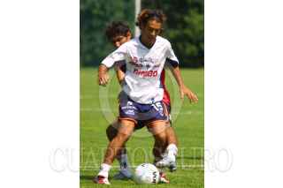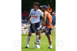 MONTERREY, NUEVO LEON 03AGOSTO2004.- El jugador Paulo Serafín observa a sus compañeros junto al preparador fisico del equipo Rayados de Monterrey durante el entrenamiento matutino. FOTO: Jorge López/CUARTOSCURO.COM