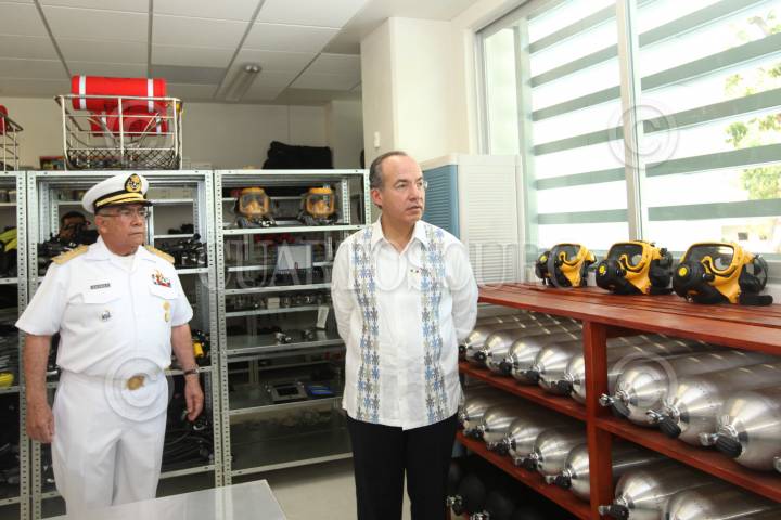 ACAPULCO, GUERRERO, 08ABRIL2011.- Felipe Calderón Hinojosa, acompañado de su esposa Margarita Zavala y del Secretario de la Marina, Francisco Saynez Mendoza, inauguraron la Escuela de Búsqueda, Rescate Buceo, Estación Naval de Búsqueda y Rescate Acapulco de la Primera Compañía de Trabajos Submarinos. FOTO: ALFREDO GUERRERO/CUARTOSCURO.COM