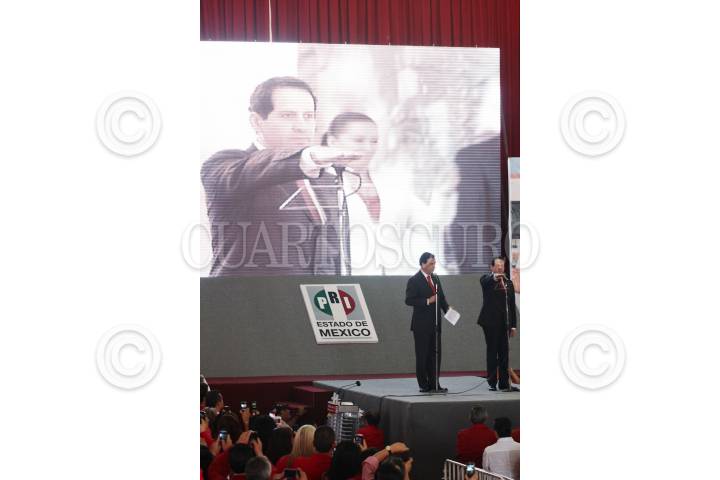 TOLUCA, ESTADO DE MÉXICO, 09ABRIL2011.-Humberto Moreira, presidente del Comité Ejecutivo Nacional del PRI, tomó la protesta estatutaria al ex alcalde de Ecatepec, Eruviel Ávila Villegas como candidato del PRI al gobierno del Estado de México. En la imagen los ex gobernadores Emilo Chuayfett Chemor, Cesar Camacho Quiroz, Alfredo de Mazo e Ignacio Pichardo Pagaza. FOTO: SAÚL LÓPEZ/CUARTOSCURO.COM