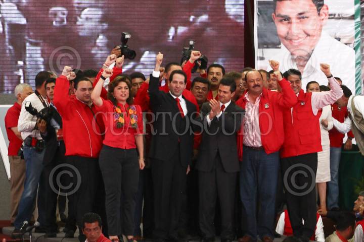 TOLUCA, ESTADO DE MÉXICO, 09ABRIL2011.-Humberto Moreira, presidente del Comité Ejecutivo Nacional del PRI, tomó la protesta estatutaria al ex alcalde de Ecatepec, Eruviel Ávila Villegas como candidato del PRI al gobierno del Estado de México. En la imagen los ex gobernadores Emilo Chuayfett Chemor, Cesar Camacho Quiroz, Alfredo de Mazo e Ignacio Pichardo Pagaza. FOTO: SAÚL LÓPEZ/CUARTOSCURO.COM