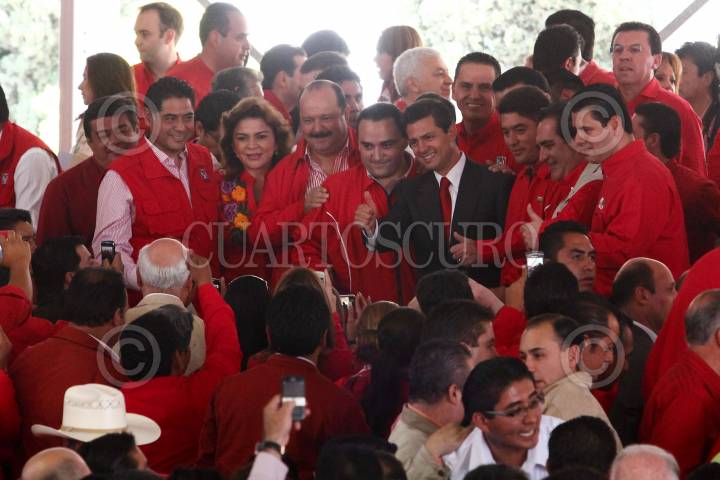 TOLUCA, ESTADO DE MÉXICO, 09ABRIL2011.-Humberto Moreira, presidente del Comité Ejecutivo Nacional del PRI, tomó la protesta estatutaria al ex alcalde de Ecatepec, Eruviel Ávila Villegas como candidato del PRI al gobierno del Estado de México. En la imagen los ex gobernadores Emilo Chuayfett Chemor, Cesar Camacho Quiroz, Alfredo de Mazo e Ignacio Pichardo Pagaza. FOTO: SAÚL LÓPEZ/CUARTOSCURO.COM