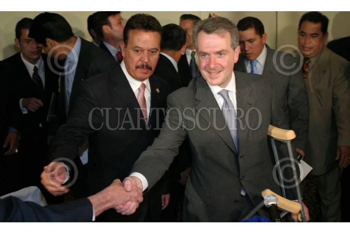 MEXDF 04AGOSTO2004.- El secretario de Gobernación, Santiago Creel y Filemón Arcos Suárez, durante la reunión con integrantes del sindicato de músicos. FOTO: Sandra Perdomo/CUARTOSCURO.COM