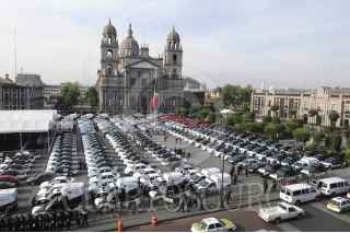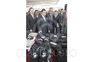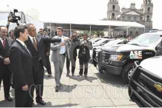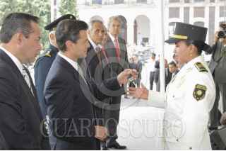 TOLUCA, ESTADO DE MÉXICO., 11ABRIL2011.- Enrique Peña Nieto, gobernador de esta entidad, acompañado del procurador, Alfredo Castillo Cervantes y de David Garay Maldonado Comisionado de la PGJEM, entregó de forma significativa a elementos de la Agencia de Seguridad Estatal, las llaves de una patrulla que forma parte del equipamiento entregado a esta institución y a la Procuraduría General de Justicia de la entidad ya la Agencia de Seguridad Estatal (ASE). FOTO: CUARTOSCURO.COM