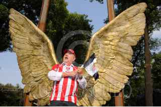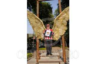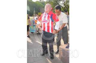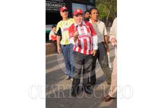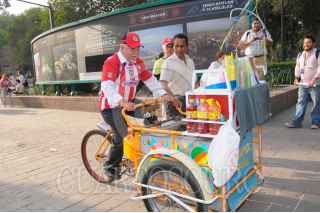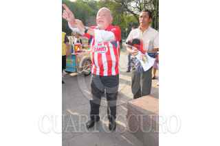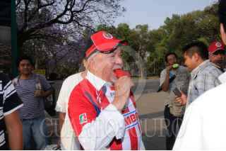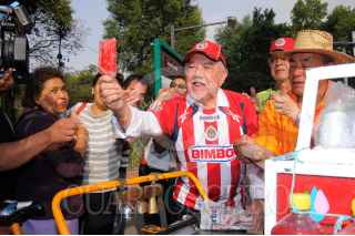 MEXICO, D.F., 11ABRIL2011.-El comediante Sergio Corona se quedó esperando a su colega Manuel "El Loco" Valdés para cobrar la apuesta que realizaron con motivo del clásico de futbol entre las chivas del Guadalajara y las águilas del América el cual consistía en que éste último vendiera paletas a lo cual sergio regalo unas a los medios de comunicacion que asisitieron. FOTO: FRANCISCO RODRIGUEZ/CUARTOSCURO.COM