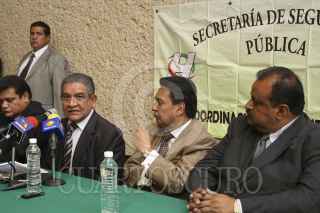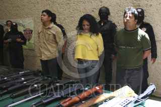 PACHUCA, HIDLGO., 11ABRIL2011.- Damián Canales Mena, secretario de Seguridad Pública de Hidalgo, presentó a tres de los detenidos y al armamento asegurado por los elementos de la policía estatal e investigadora la madrugada del pasado domingo 10 de abril en Tulancingo. En el armamento decomisado se encuentran siete armas calibre 7.62 cuernos de chivo, dos armas calibre 5.56, una mira telescópica, tres chalecos antibalas con la leyenda "Marina" en la espalda y dos vehículos reportados como robados. FOTO: CUARTOSCURO.COM
