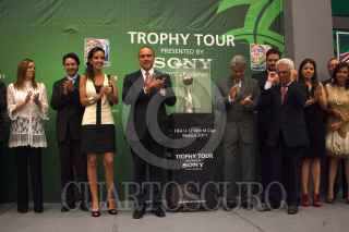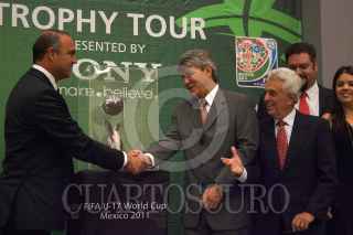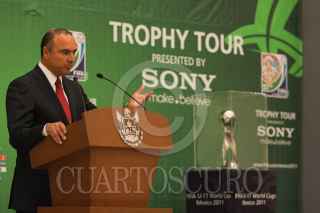 QUERÉTARO, QUERÉTARO, 12ABRIL2011.- El gobernador del estado José Calzada encabezó el acto protocolario de la presentación de la copa del Mundial de Fútbol Sub 17. En la presentación estuvo el técnico mexicano Jesús "Chucho" Ramírez, campeón del mundo en esta categoría, y Justino Compeán, presidente del Comité Organizador del Mundial Fútbol Sub 17 y Yon De Luisa, director del Comité Organizador del Mundial de Fútbol Sub 17. FOTO: DEMIAN CHÁVEZ/CUARTOSCURO.COM