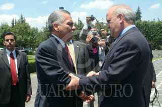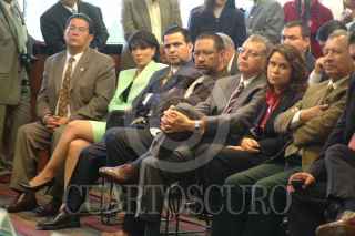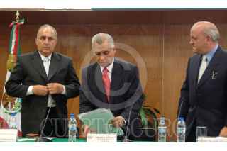 MEXICO, D.F. 05AGOSTO2004.- Bitar Haddad, diputado, Rafael Macedo de la Concha, Procurador General de la República, y Jaime Miguel Moreno Garavilla, presidente de la comisión cudadana en la Cámara de Diputados, previo a iniciar la ponencia magistral del Procurador. FOTO: Iván Stephens/CUARTOSCURO.COM