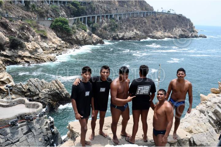 ACAPULCO, GUERRERO, 14ABRIL2011.- Clavadistas de La Quebrada efectuaron una exhibición con playeras negras y mensajes alusivos a la defensa del Tianguis Turístico, el cual se anunció cambiaría de sede para el próximo año. Diferentes sectores productivos del puerto se han sumado a esta campaña que exigen que el "Tianguis" se quede, por lo pronto estos desafiantes de la quebrada han emplazado a una huelga de no cumplirse esta demanda. FOTO: BERNANDINO HERNÁNDEZ/CUARTOSCURO.COM