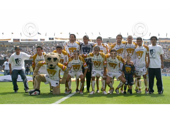 México, d.F. 08 AGOSTO 2004.- Al centro Francisco ¨kikin¨Fonseca, delantero de los Pumas de la Universidad y Arturo Elías Ayud, presidente del patronato, levantan el trofeo que dicho equipo le ganó al Pachuca con un marcador global de 7 goles a 3 en el partido de campeón de campeones. FOTO: Sandra Perdomo/CUARTOSCURO.COM