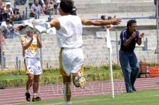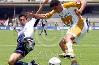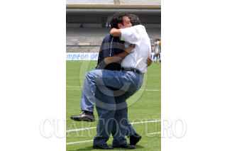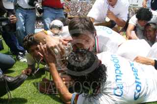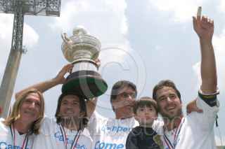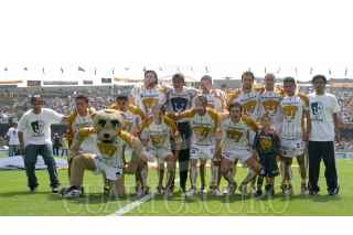 México, d.F. 08 AGOSTO 2004.- Al centro Francisco ¨kikin¨Fonseca, delantero de los Pumas de la Universidad y Arturo Elías Ayud, presidente del patronato, levantan el trofeo que dicho equipo le ganó al Pachuca con un marcador global de 7 goles a 3 en el partido de campeón de campeones. FOTO: Sandra Perdomo/CUARTOSCURO.COM