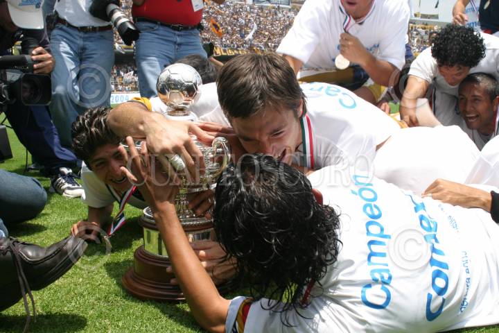 México, d.F. 08 AGOSTO 2004.- Al centro Francisco ¨kikin¨Fonseca, delantero de los Pumas de la Universidad y Arturo Elías Ayud, presidente del patronato, levantan el trofeo que dicho equipo le ganó al Pachuca con un marcador global de 7 goles a 3 en el partido de campeón de campeones. FOTO: Sandra Perdomo/CUARTOSCURO.COM