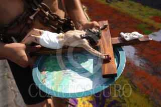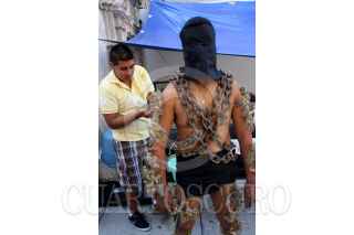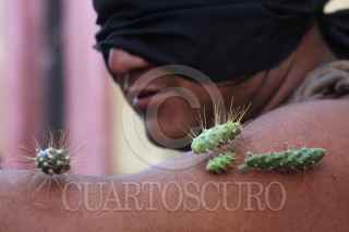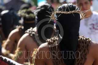 ATLIXCO, PUEBLA, 22ABRIL2011.- Como cada viernes santo, se realizó la procesión de "Engrillados" del municipio de Atlixco, en el cual 50 penitentes participaron cargando pesadas cadenas y espinas en su cuerpo, recorrieron más de 2 kilómetros desde su salida de la capilla de la Tercera Orden hasta llegar al templo de San Francisco, como parte de las tradiciones religiosas de esta semana santa. FOTO: FRANCISCO GUASCO/CUARTOSCURO.COM