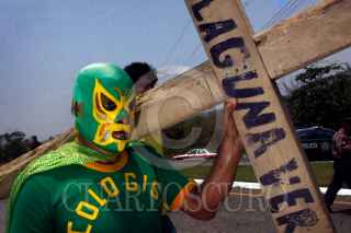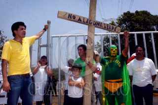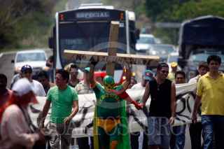 ALTO LUCERO, VERACRUZ., 22ABRIL2011.- Grupos ambientalistas de diferentes regiones del estado realizaron el tradicional vía crucis ecológico por la carretera federal Veracruz - Poza Rica para culminar en las instalaciones de la Central Nuclear de Laguna Verde, en este sitio los manifestantes exigieron el cierre total de la planta, asegurando que se puede registrar una tragedia como la de este año en Fukushima, al finalizar la protesta efectuaron la clausura simbólica de la misma. FOTO: FÉLIX MÁRQUEZ/CUARTOSCURO.COM