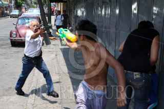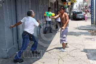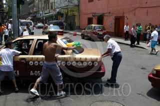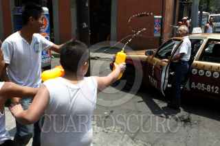 MÉXICO, D.F., 23ABRIL2011.- Un grupo de niños y jóvenes en la calle de Colombia en el Centro Histórico, mojaron a un taxista que circulaba por el lugar en este Sábado de Gloria en donde pasaron por alto la recomendaciones de abstenerse de desperdiciar el vital liquido. FOTO: RODOLFO ANGULO/CUARTOSCURO.COM