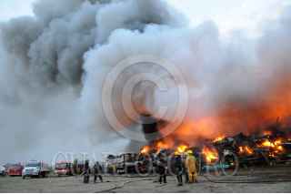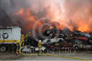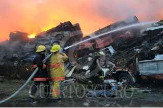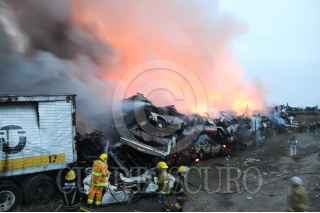 SAN SALVADOR ATENCO, ESTADO DE MÉXICO, 25ABRIL2011.- A la altura del kilómetro 24 de la carretera federal Texcoco-Lechería, en el municipio de San Salvador Atenco; un corralón de vehículos chatarra fue consumido por el fuego, al momento se reporta un bombero herido. La Agencia de Seguridad Estatal (ASE) informó que el incendio se registra en un lote de aproximadamente 3 mil metros cuadrados, ubicado en la población La Pastoría. Señalaron que se desconoce el origen de la conflagración que se registra en el depósito de vehículos con razón social Grúas Romero, donde se encuentran apilados hasta nueve filas de vehículos. FOTO: CUARTOSCURO.COM