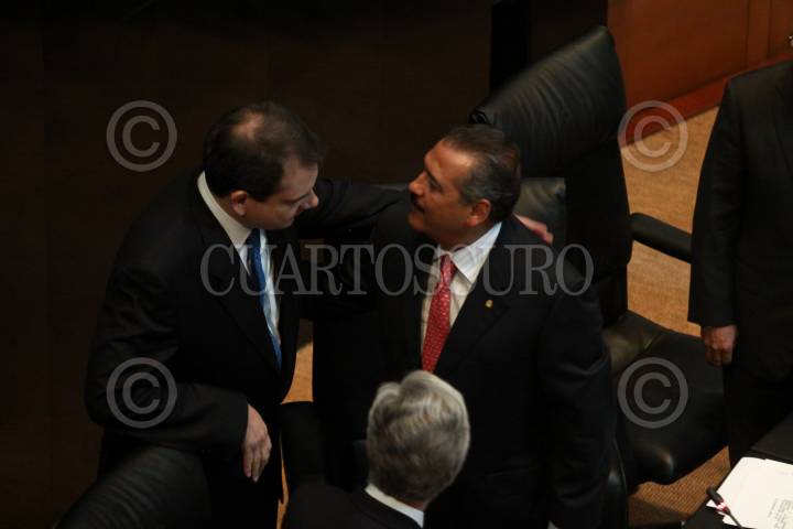 MÉXICO, D.F., 26ABRIL2011.- Manuel Ramos Francia saluda al senador Manlio Fabio Beltrones después de su ratificación como subgobernador del Banco de México durante la sesión ordinaria en el Senado de la República. FOTO: RODOLFO ANGULO/CUARTOSCURO.COM