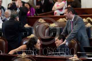 MÉXICO, D.F., 27ABRIL2011.- Los panistas Mariana Gómez del Campo, José Giovani Gutiérrez Aguilar y José Manuel Rendón Oberhauser, durante la sesión en la que se entregó las medallas al mérito deportivo y ciudadano en la Asamblea Legislativa. FOTO: MOISÉS PABLO/CUARTOSCURO.COM