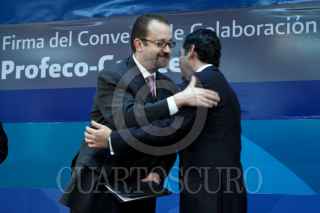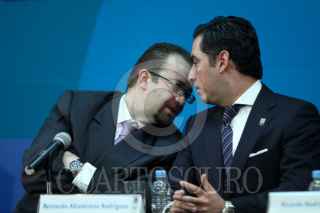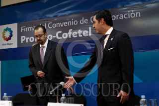 MÉXICO, D.F., 28ABRIL2011.- Mony de Swann Adatti, presidente de la Cofetel y Bernardo Altamirano titular de Profeco durante una firma de convenio de colaboración Profeco-Cofetel. FOTO: RODOLFO ANGULO/CUARTOSCURO.COM