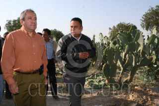 ACATZINGO, PUEBLA, 28ABRIL2011.- Productores de tuna y nopal en la región de San Sebastián Villanueva enviaron su primera embarcación al país de Holanda, posicionandolos como los primeros productores en exportar a la Unión Europea. En la imagen: Pedro Adalberto González Hernández, titular de la SDR estatal, acompañado de Eliseo Zayas Jaen, presidente municipal, estuvieron presentes en el banderaso de salida del primer envío de tuna poblana a la Unión Europea.l FOTO: FRANCISCO GUASCO/CUARTOSCURO.COM