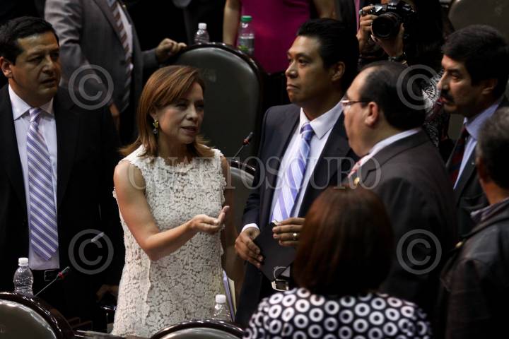 MÉXICO, D.F., 28ABRIL2011.- La diputada del PAN, Josefina Vazquez Mots conversa con el diputado del PRI, Carlos Ramírez Marin, presidente de la mesa directiiva durante la sesión ordinaria en la Cámara de Diputados. FOTO: RODOLFO ANGULO/CUARTOSCURO.COM
