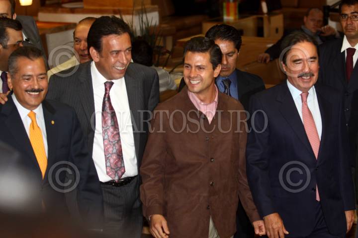 MÉXICO, D.F., 03MAYO2011.- Manlio Fabio Beltrones, presidente de la mesa directiva del Senado de la República conversa con Enrique Peña Nieto, gobernador del Estado de México al termino de una reunión en un restaurante de un hotel en Polanco. FOTO: RODOLFO ANGULO/CUARTOSCURO.COM