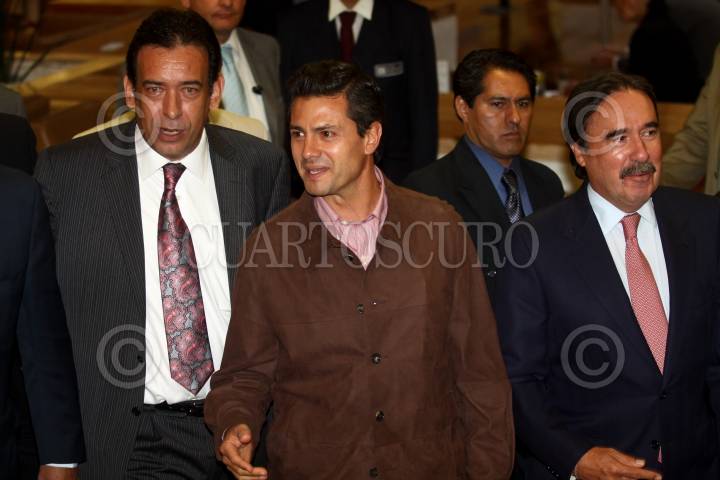 MÉXICO, D.F., 03MAYO2011.- Manlio Fabio Beltrones, presidente de la mesa directiva del Senado de la República conversa con Enrique Peña Nieto, gobernador del Estado de México al termino de una reunión en un restaurante de un hotel en Polanco. FOTO: RODOLFO ANGULO/CUARTOSCURO.COM
