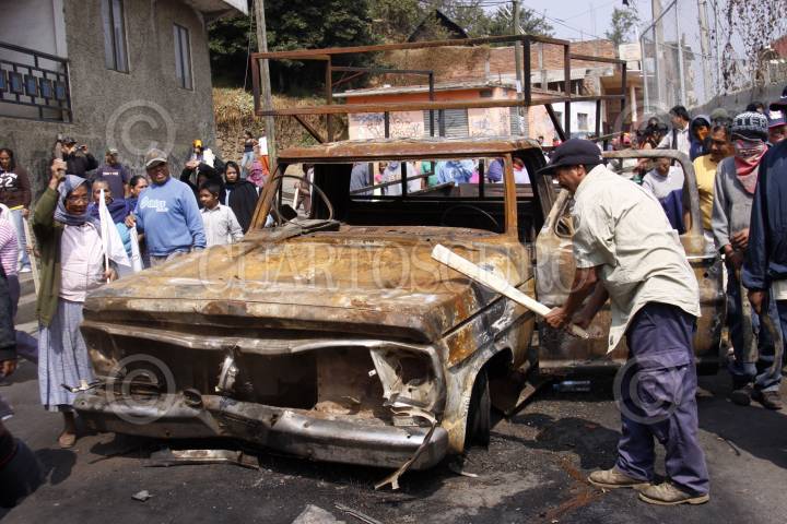 CHERÁN, MICHOACÁN, 03MAYO2011.- Habitantes de la comunidad Purépecha mantienen un estado de sitio permanente con barricadas en cada calle dentro de la comunidad de 20 mil habitantes luego de registrarse un enfrentamiento con talamontes protegidos por un grupo armado que dejó como saldo dos comuneros muertos y 10 vehiculos incinerados que fueron detenidos con madera. Los comuneros mantienen bloqueos permanentes y buscan que las autoridades garanticen su seguridad por lo que piden la presencia del ejército. FOTO: IVAN STEPHENS/CUARTOSCURO.COM