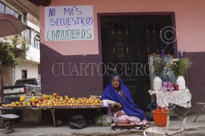 CHERÁN, MICHOACÁN, 03MAYO2011.- Habitantes de la comunidad Purépecha mantienen un estado de sitio permanente con barricadas en cada calle dentro de la comunidad de 20 mil habitantes luego de registrarse un enfrentamiento con talamontes protegidos por un grupo armado que dejó como saldo dos comuneros muertos y 10 vehiculos incinerados que fueron detenidos con madera. Los comuneros mantienen bloqueos permanentes y buscan que las autoridades garanticen su seguridad por lo que piden la presencia del ejército. FOTO: IVAN STEPHENS/CUARTOSCURO.COM