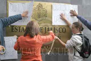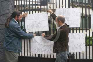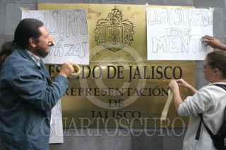 MEXICO, D.F.20AGOSTO2004.-Gerardo Fernandez Noroña, miembro del consejo ejècutivo del PRD, e Inti Muñoz, diputado federal, clausuraron simbólicamente la representación del Estado de Jalisco en el D.F., por las detenciones arbitrarias a altermundistas que protestaron en la III cumbre de gobierno de América Latina Europa y el Caribe. FOTO:Juan Pablo Zamora/CUARTOSCURO.COM