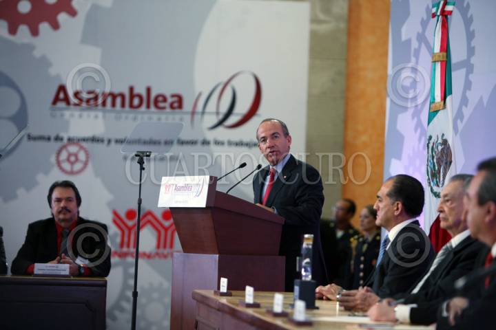 MÉXICO, D.F., 06MAYO2011.- El Presidente de los Estados Unidos Mexicanos Felipe Calderón Hinojosa durante la ceremonia de clausura de la Asamblea 100 del Instituto del Fondo Nacional de la Vivienda para los Trabajadores, en el salón Adolfo López Mateos de la residencia oficial de Los Pinos. FOTO: ARIEL GUTIERREZ/CUARTOSCURO.COM