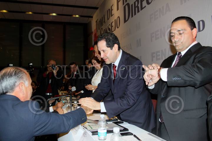MÉXICO, D.F., 06MAYO2011.- Eruviel Ávila, pre-candidato a la gubernatura del Estado de México, Alfredo del Mazo Maza, alcalde de Huixquilucan y Luis Videgaray, diputado federal, al finalizar la ceremonia de toma de protesta del consejo directivo nacional de la Federación Nacional de Municipios de México AC (FENAMM). FOTO: MOISÉS PABLO/CUARTOSCURO.COM