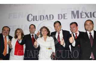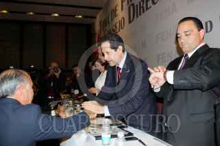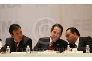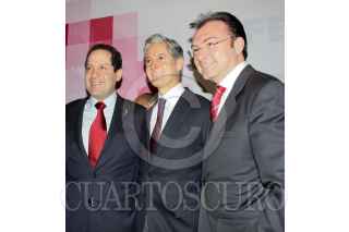 MÉXICO, D.F., 06MAYO2011.- Eruviel Ávila, pre-candidato a la gubernatura del Estado de México, Alfredo del Mazo Maza, alcalde de Huixquilucan y Luis Videgaray, diputado federal, al finalizar la ceremonia de toma de protesta del consejo directivo nacional de la Federación Nacional de Municipios de México AC (FENAMM). FOTO: MOISÉS PABLO/CUARTOSCURO.COM