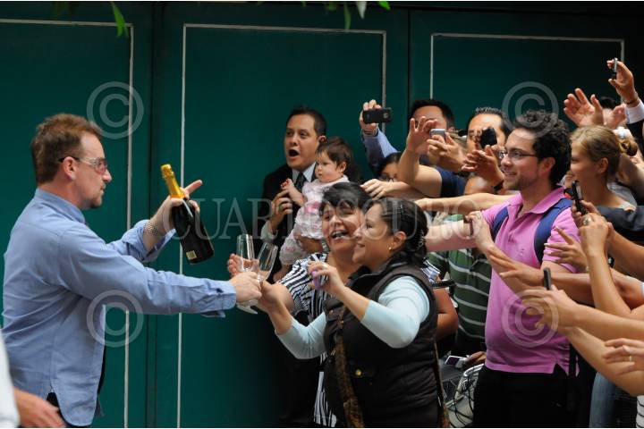 MÉXICO, D.F., 10MAYO2011.- Bono, vocalista de la banda de rock, U2, brindaron con fans con motivo del cumpleaños 51 del rockero irlandes. Esto en el marco de su gira 360 grados que comienza el 11 de Mayo en el estadio Azteca de esta capital. FOTO: FRANCISCO RODRIGUEZ/CUARTOSCURO.COM