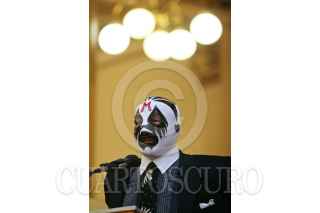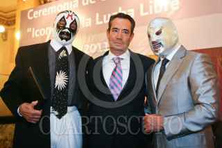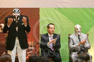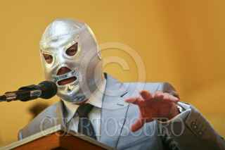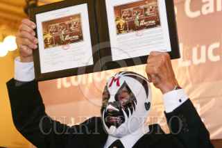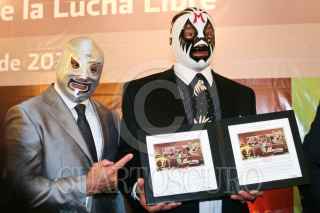 MÉXICO, D.F., 11MAYO2011.- El luchador Mil Máscaras, acompañado por el Hijo del Santo, presentó una estampilla que inmortaliza al gladiador como icono de la lucha libre a través del Servicio Postal Mexicano. FOTO: ISAAC ESQUIVEL/CUARTOSCURO.COM