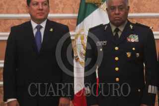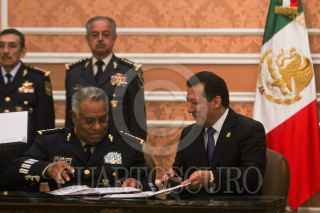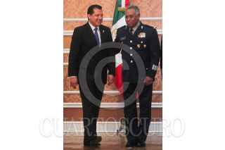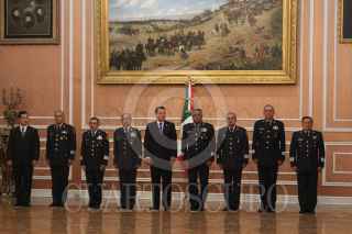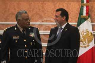 MÉXICO, D.F., 12MAYO2011.- Guillermo Galvan Galvan, Secretario de la Defensa Nacional junto a Raúl Plascencia Villanueva, Presidente de la Comisión Nacional de los Derechos Humanos durante la ceremonia de firma de convenios entre la SEDENA Y la CNDH. FOTO: ENRIQUE ORDÓÑEZ/CUARTOSCURO.COM