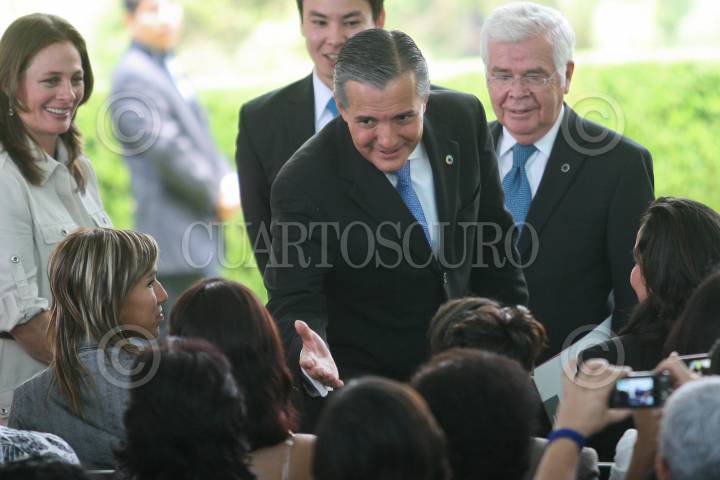 MÉXICO, D.F., 12MAYO2011.- Heriberto Félix Guerra, titular de Sedesol, Felipe Calderón Hinojosa, presidente de México, y Margarita Zavala de Calderón, durante la entrega de reconocimientos a encargadas de estancias infantiles en el país, en la residencia oficial de Los Pinos. FOTO: ISAAC ESQUIVEL/CUARTOSCURO.COM