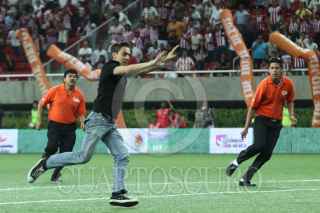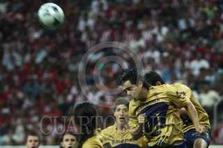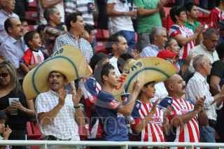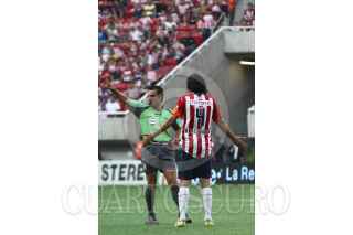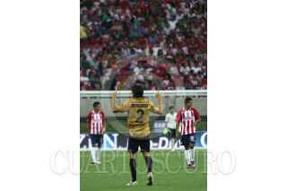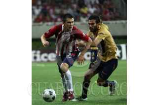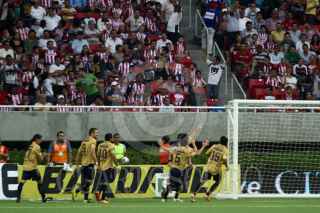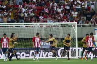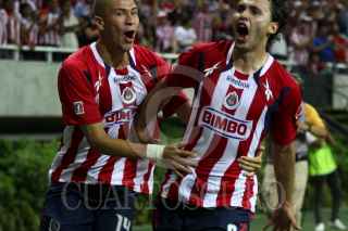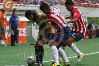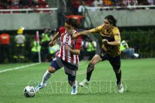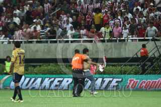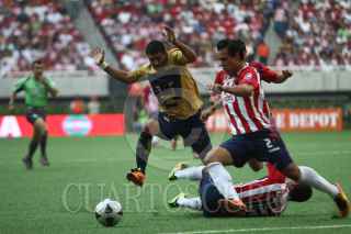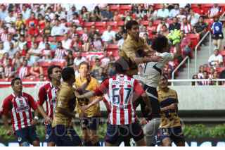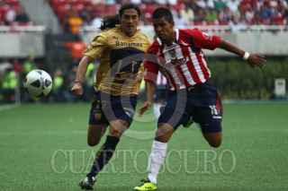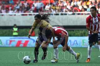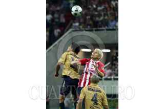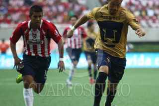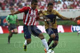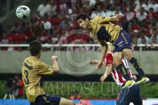 ZAPOPAN, JALISCO, 12MAYO2011.- Adolfo Bautista de las Chivas del Guadalajara pelea el balón durante el encuentro en contra de los Pumas de la UNAM; partido de ida de las semifinales del futbol mexicano del torneo Clausura 2011 que se realizó en el estadio Omnilife y quedo empatado a 1 gol. FOTO: RODOLFO ANGULO/CUARTOSCURO.COM