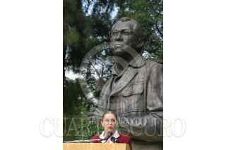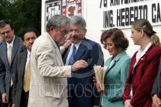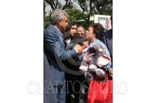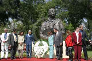 MEXICO, D. F. 23AGOSTO2004.- Andrés Manuel López Obrador, jefe de gobierno del D. F., María del Carmen Juárez viuda de Castillo y Leonel Godoy, presidente nacional del PRD colocan una ofrenda al pie de la escultura del ingeniero Heberto Castillo con motivo de su 76 natalicio. FOTO: Nelly Salas/CUARTOSCURO.COM