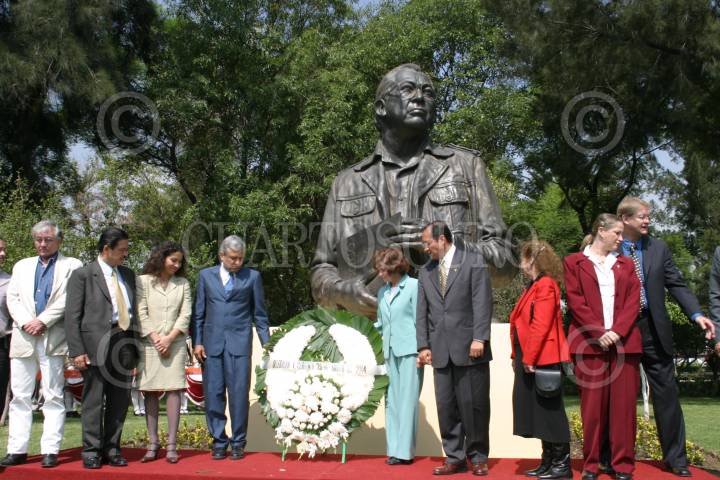 MEXICO, D. F. 23AGOSTO2004.- Andrés Manuel López Obrador, jefe de gobierno del D. F., María del Carmen Juárez viuda de Castillo y Leonel Godoy, presidente nacional del PRD colocan una ofrenda al pie de la escultura del ingeniero Heberto Castillo con motivo de su 76 natalicio. FOTO: Nelly Salas/CUARTOSCURO.COM