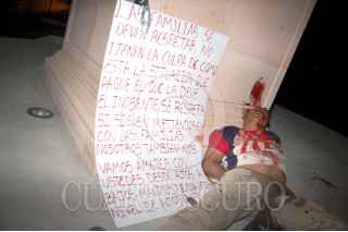 NUEVO LAREDO, TAMAULIPAS, 19MAYO2011.- El cuerpo de un hombre sin vida y con huellas evidentes de haber sido torturado fue arrojado esta madrugada en el cruce de las calles Paseo Colón y Leandro Valle al pie de un monumento en un sector residencial. Las autoridades no han pudieron establecerse la identidad del occiso que vestía una playera deportiva pantalón color café y de una edad aproximada a los 24 años. Junto a su cuerpo las autoridades encontraron una manta supuestamente elaborada por algún grupo de la delincuencia organizada. FOTO: JOAQUIN MURRIETA/CUARTOSCURO.COM