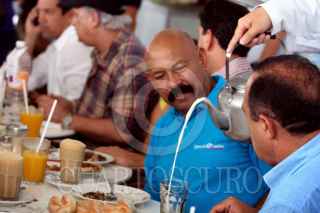 BOCA DEL RÍO, VERACRUZ., 19MAYO2011.- El cantante venezolano Oscar D´ León, mejor conocido como "El Diablo de la Salsa", arribó a esta ciudad en donde acudió a un tradicional café para convivir con las autoridades y la prensa previo al gran Festival Internacional de Salsa que inicia esta noche. FOTO: FÉLIX MÁRQUEZ/CUARTOSCURO.COM