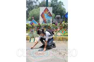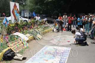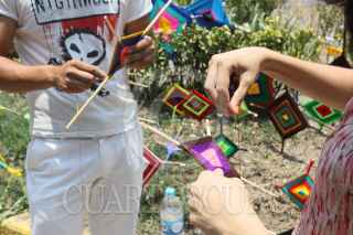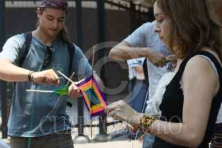 MÉXICO, D.F., 20MAYO2011.- Un grupo de activistas de diversas organizaciones civiles se manifestó frente a la Embajada de Canadá para exigir el retiro de las 22 concesiones que el gobierno mexicano le otorgó a la empresa First Majestic Silver, para explotar yacimientos de oro y plata en la zona sagrada de Wirikuta, en San Luis Potosí. Los participantes realizaron artesanías huicholes llamados "ojos de dios" como parte de su manifestación. FOTO: MOISÉS PABLO/CUARTOSCURO.COM