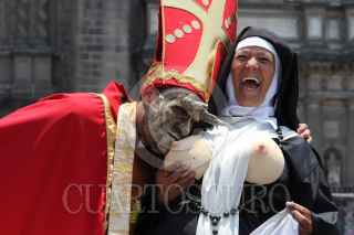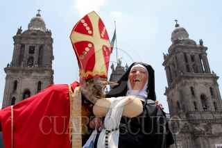MÉXICO, D.F., 22MAY02011.- Un grupo de activistas realizaron una escena en reproche a la iglesia católica desde la plancha del zócalo capitalino al termino de la misa del cardenal Norberto rivera en la catedral metropolitana. FOTO: ENRIQUE ORDÓÑEZ/CUARTOSCURO.COM
