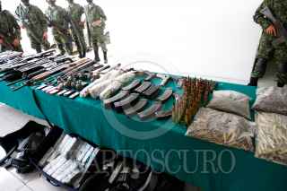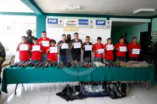 VILLAHERMOSA, TABASCO, 22MAYO2011.- Una banda de presuntos sicarios y secuestradores fue presentada en las instalaciones de la Policía Ministerial bajo un fuerte dispositivo de seguridad. Según las autoridades, los hoy detenidos en su mayoría jóvenes pretendían librar una batalla en enfrentamiento contra uniformados de la milicia y cuerpos policías estatales; así mismo se le aseguran un gran arsenal de armas y lujosos vehículos. FOTO: MARCO POLO GUZMÁN HERNÁNDEZ/CUARTOSCURO.COM