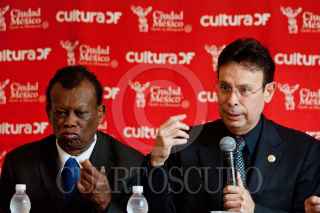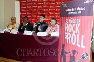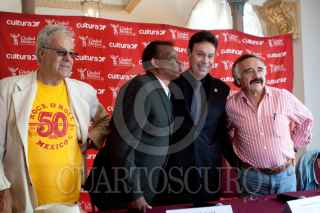 MÉXICO, D.F., 25MAYO2011.- Johny Laboriel, cantante rockanrolero, y Armando Báez Pinal, secretario general Sindicato Único de Trabajadores de la Música, ofrecieron una conferencia prensa para hablar sobre el concierto en el que cual festejarán los 50 años del rock en México en el teatro de la Ciudad Esperanza Iris. FOTO: MOISÉS PABLO/CUARTOSCURO.COM