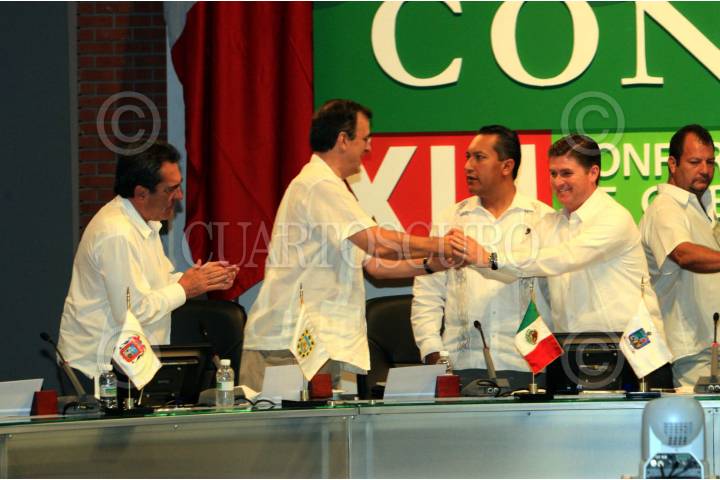 MONTERREY, NUEVO LEÓN, 27MAYO2011.- José Francisco Blake Mora, Secretario de Gobernación, y Rodrigo Medina, gobernador de la entidad nuevoleonesa, durante la XLl de la Conferencia Nacional de Gobernadores (CANAGO). FOTO: SEGOB/CUARTOSCURO.COM